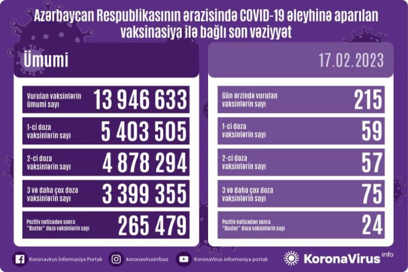 Azərbaycanda son sutkada koronavirus (COVID-19) əleyhinə 215 vaksin vurulub. Bir gündə birinci mərhələ üzrə vaksinasiya olunanların sayı 59, ikinci mərhələ üzrə vaksinasiya olunanların sayı 57, üç və daha çox doza üzrə vaksinasiya olunanların sayı 75, pozitiv nəticədən sonra buster doza üzrə vaksinasiya olunanların sayı 24 nəfərdir.