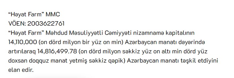 “Həyat Farm” MMC şirkətinin nizamnamə kapitalı 14 milyon 110 min manat artırılıb.