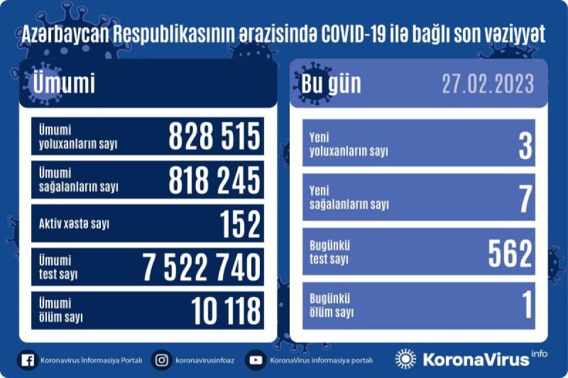 Fevralın 27-si tarixinə əsasən, Azərbaycan Respublikasında koronavirus (COVID-19) infeksiyasına 3 yeni yoluxma faktı qeydə alınıb, 7 nəfər müalicə olunaraq sağalıb.