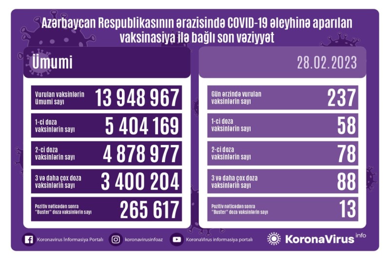 Azərbaycanda son sutkada koronavirus (COVID-19) əleyhinə 237 vaksin vurulub. Bir gündə birinci mərhələ üzrə vaksinasiya olunanların sayı 58, ikinci mərhələ üzrə vaksinasiya olunanların sayı 78, üç və daha çox doza üzrə vaksinasiya olunanların sayı 88, pozitiv nəticədən sonra buster doza üzrə vaksinasiya olunanların sayı 13 nəfərdir.