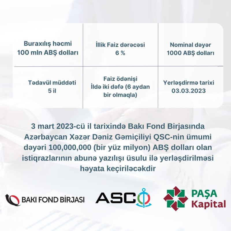 Birjanın yaydığı məlumatda bildirilir ki, 3 mart 2023-cü il tarixində Bakı Fond Birjasında Azərbaycan "Xəzər Dəniz Gəmiçiliyi" QSC-nin ümumi dəyəri 100 milyon ABŞ dolları olan istiqrazlarının abunə yazılışı üsulu ilə yerləşdirilməsi həyata keçiriləcəkdir.