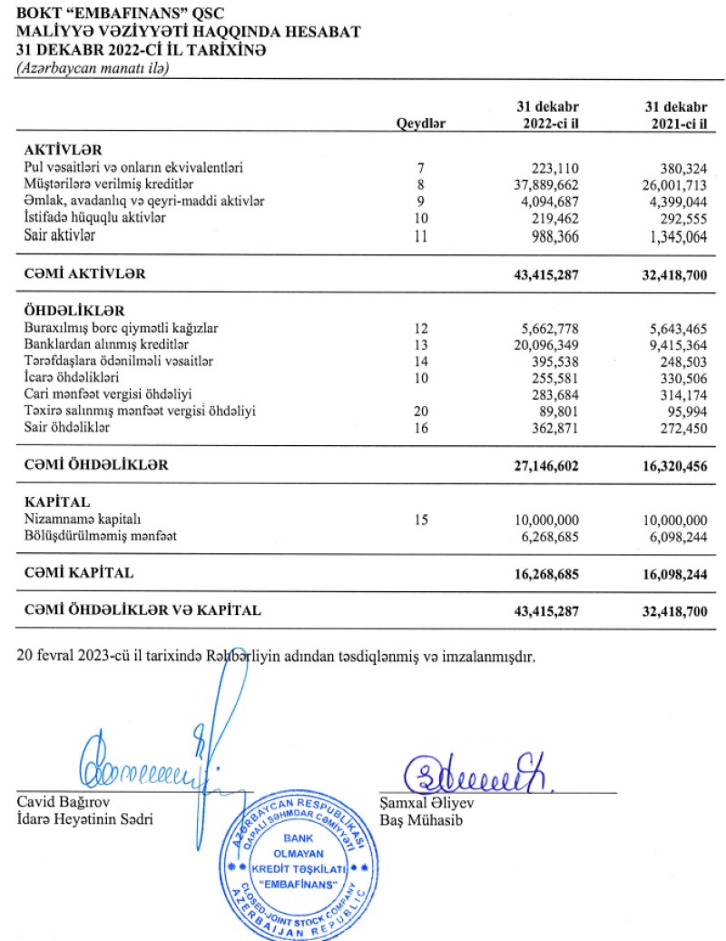 31 Dekabr 2022-ci il tarixində "Embafinans" QSC 16 milyon 269 min manat cəmi kapitala malik olub.