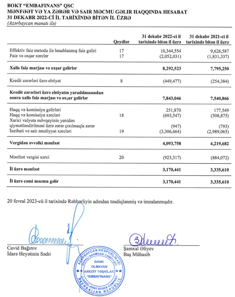 Bank Olmayan Kredit Təşkilatı "Embafinans" QSC 2022-ci ili 3 milyon 170 min manat xalis mənfəət ilə başa vurub.