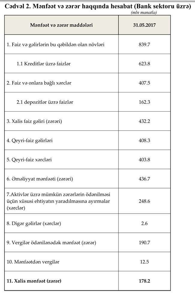 2017-ci ilin 5 ayı ərzində bank sektorunun xalis mənfəəti 178,2 milyon manat təşkil edib.