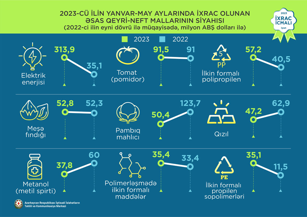 2023-cü ilin yanvar-may ayları ərzində ixrac edilən qeyri-neft sektoruna aid malların siyahısında elektrik enerjisi (313,9 milyon ABŞ dolları) birinci olub. Bu siyahıda pomidor (tomat) (91,5 milyon ABŞ dolları) ikinci, ilkin formalı polipropilen (57,2 milyon ABŞ dolları) isə üçüncü yerdə qərarlaşıb.