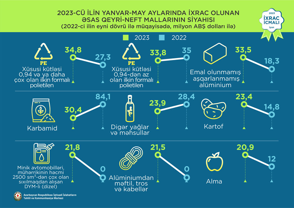 İqtisadi İslahatların Təhlili və Kommunikasiya Mərkəzinin (İİTKM) təqdim etdiyi “İxrac icmalı”nın iyun sayına əsasən, 2023-cü ilin yanvar-may ayları ərzində Azərbaycanın ümumi ixracı 16,1 milyard ABŞ dolları, qeyri-neft sektoru üzrə ixrac 1,5 mlrd. ABŞ dolları təşkil edib. Qeyri-neft sektoru üzrə ixrac 2022-ci ilin müvafiq dövrü ilə müqayisədə 22,1% artıb. 2023-cü ilin yanvar-may ayları ərzində yeyinti məhsulları üzrə ixrac 334,4 milyon ABŞ dollarına bərabər olub.