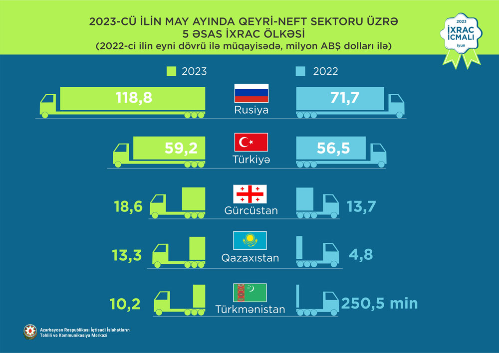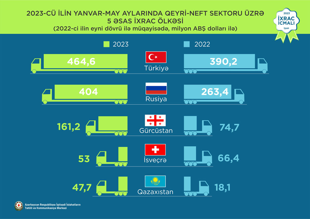 2023-cü ilin yanvar-may ayları ərzində Türkiyəyə 464,6 milyon ABŞ dolları, Rusiyaya 404 milyon ABŞ dolları, Gürcüstana 161,2 milyon ABŞ dolları, İsveçrəyə 53 milyon ABŞ dolları, Qazaxıstana isə 47,7 milyon ABŞ dolları dəyərində qeyri-neft sektoruna aid mal ixrac olunub.