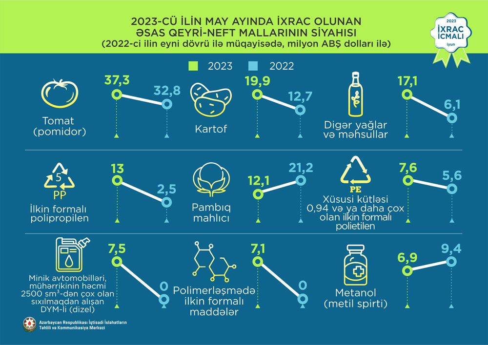 2023-cü ilin may ayında ixrac edilən qeyri-neft sektoruna aid malların siyahısında pomidor (tomat) (37,3 milyon ABŞ dolları) birinci, kartof (19,9 milyon ABŞ dolları) ikinci və daş kömür qatranının yüksək temperaturlu qovulmanın təmizlənməmiş digər yüngül yağları və məhsulları (17,1 milyon ABŞ dolları) üçüncü olub.