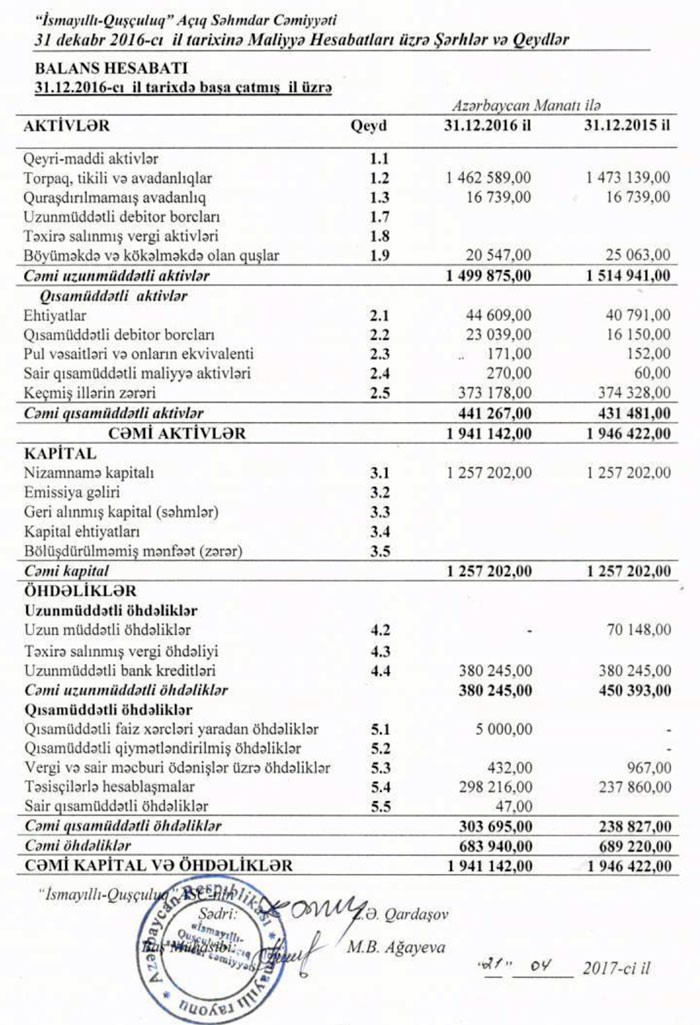 31 Dekabr 2016-cı il tarixində “İsmayıllı Quşçuluq” ASC 1,91 milyon manat cəmi aktivlərə, 684 min manat öhdəliklərə və 1,3 milyon manat cəmi kapitala malik olub. ASC-nin banklara 380,2 min manat, təsisçilərə isə (Qardaşov Zahidə) təxminən 300 min manat borcu var.