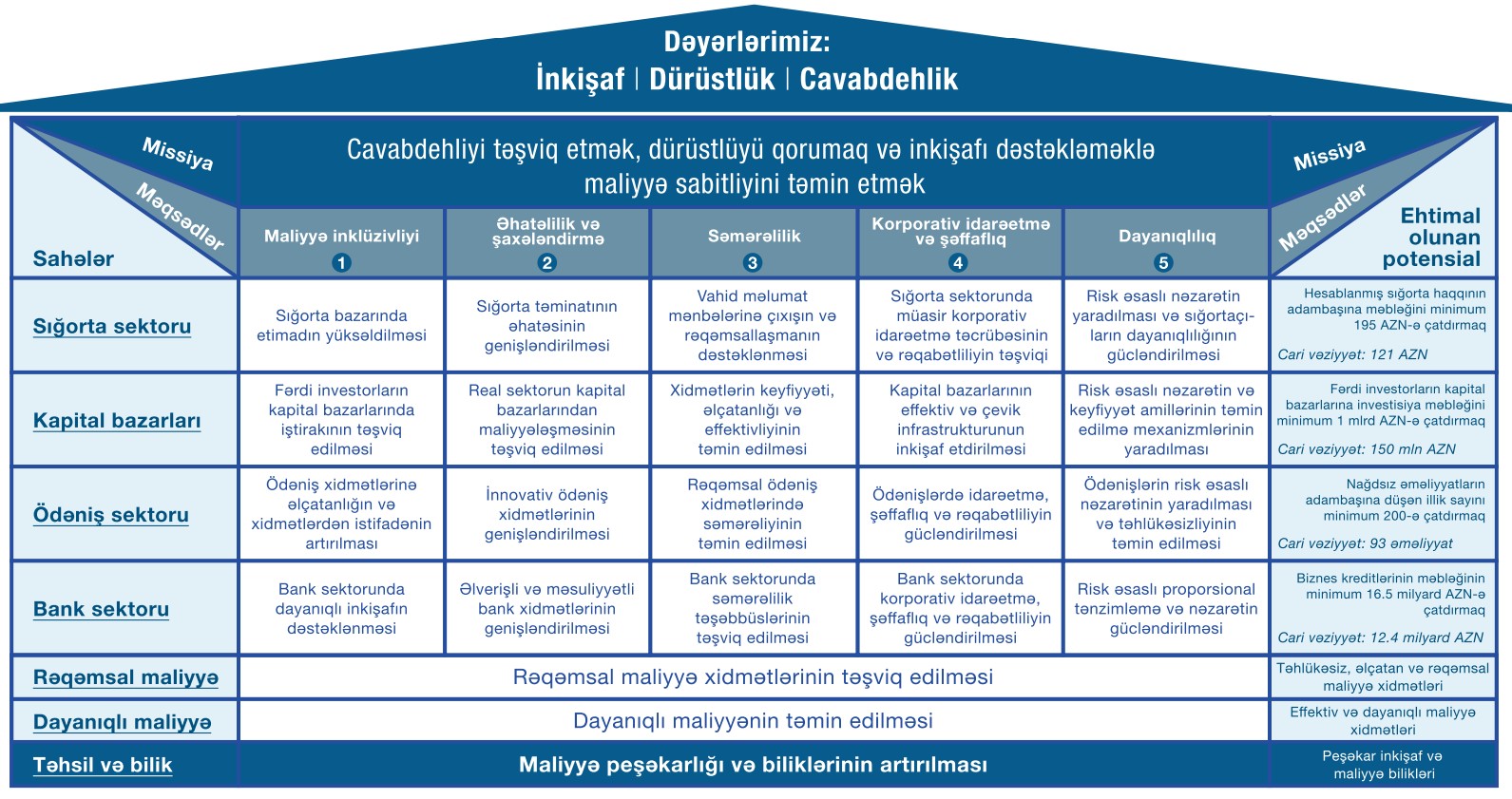 Belə ki, hesablanmış sığorta haqqının adambaşına məbləğini minimum 195 manata çatdırmaq (cari vəziyyət: 121 manat), fərdi investorların kapital bazarlarına investisiya məbləğini minimum 1 milyard manata çatdırmaq (cari vəziyyət: 150 milyon manat), nağdsız əməliyyatların adambaşına düşən illik sayını minimum 200-ə çatdırmaq (cari vəziyyət: 93 əməliyyat), biznes kreditlərinin məbləğinin minimum 16.5 milyard manata çatdırmaq (cari vəziyyət: 12.4 milyard manat) hədəflənir.
