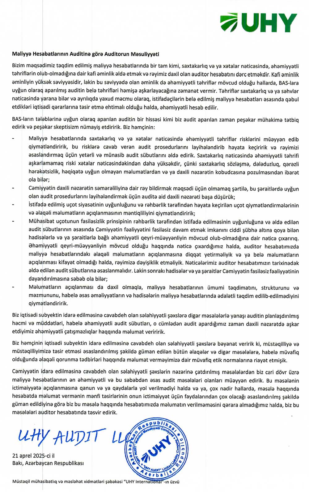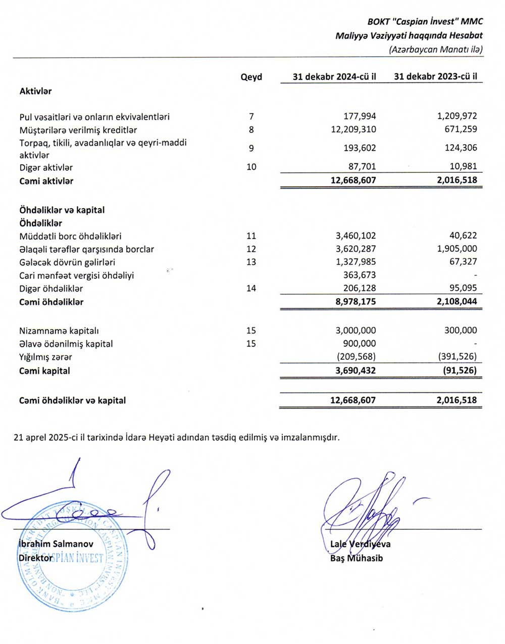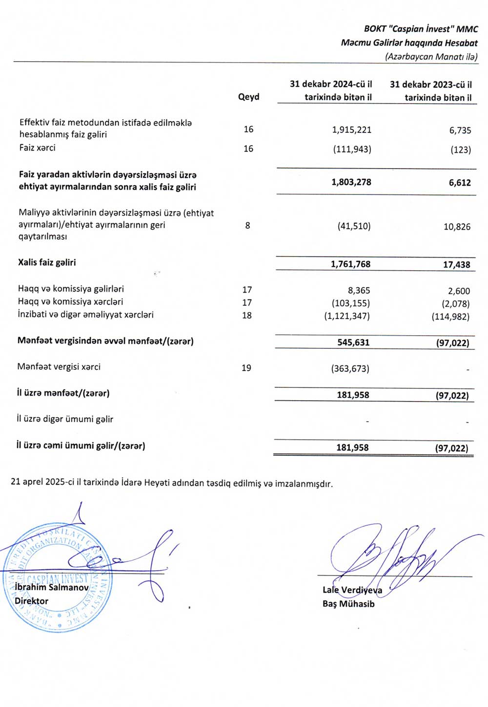 "BANK OLMAYAN KREDİT TƏŞKİLATI CASPİAN İNVEST" MƏHDUD MƏSULİYYƏTLİ CƏMİYYƏTİ 31 dekabr 2024-cü il tarixinə Maliyyə Hesabatlarının Beynəlxalq Standartlarına uyğun hazırlanmış Maliyyə Hesabatları və Müstəqil Auditorların Hesabatı - ƏTRAFLI