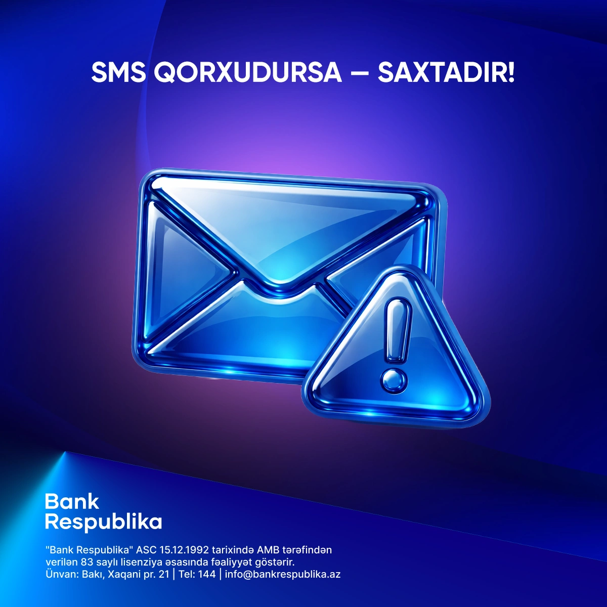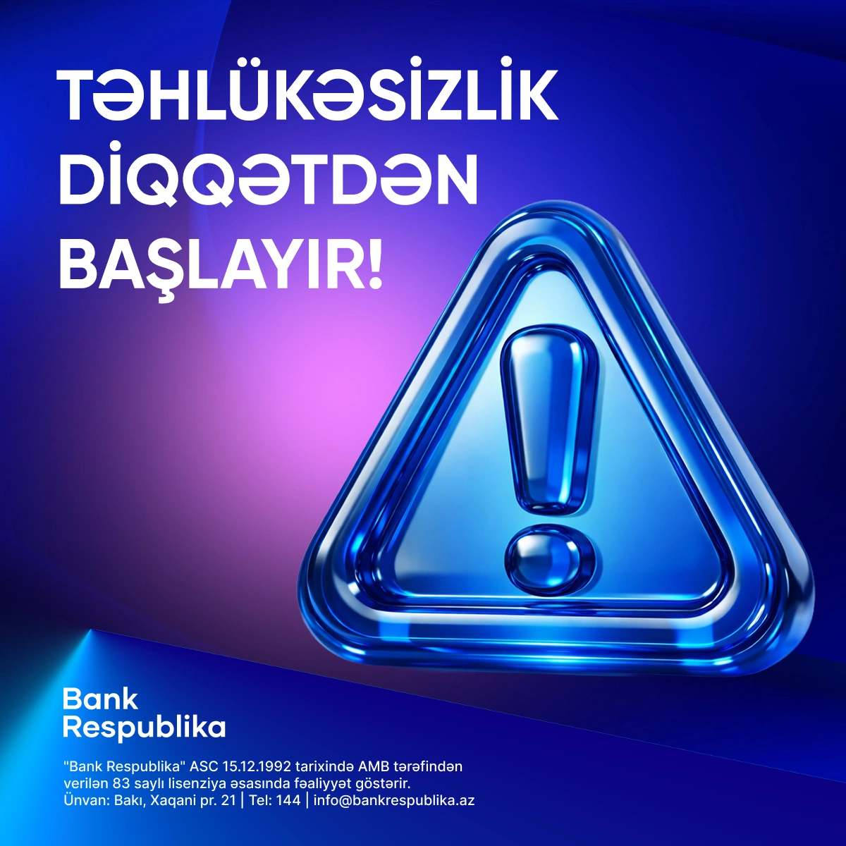 Bank Respublika heç bir halda müştərilərindən telefon, SMS, e-mail və ya sosial şəbəkələr vasitəsilə kartın məxfi məlumatlarını tələb etmir. Şübhəli vəziyyətlə qarşılaşdıqda əməliyyatı dərhal dayandırmaq və bankın rəsmi əlaqə kanalları ilə əlaqə saxlamaq tövsiyə olunur.