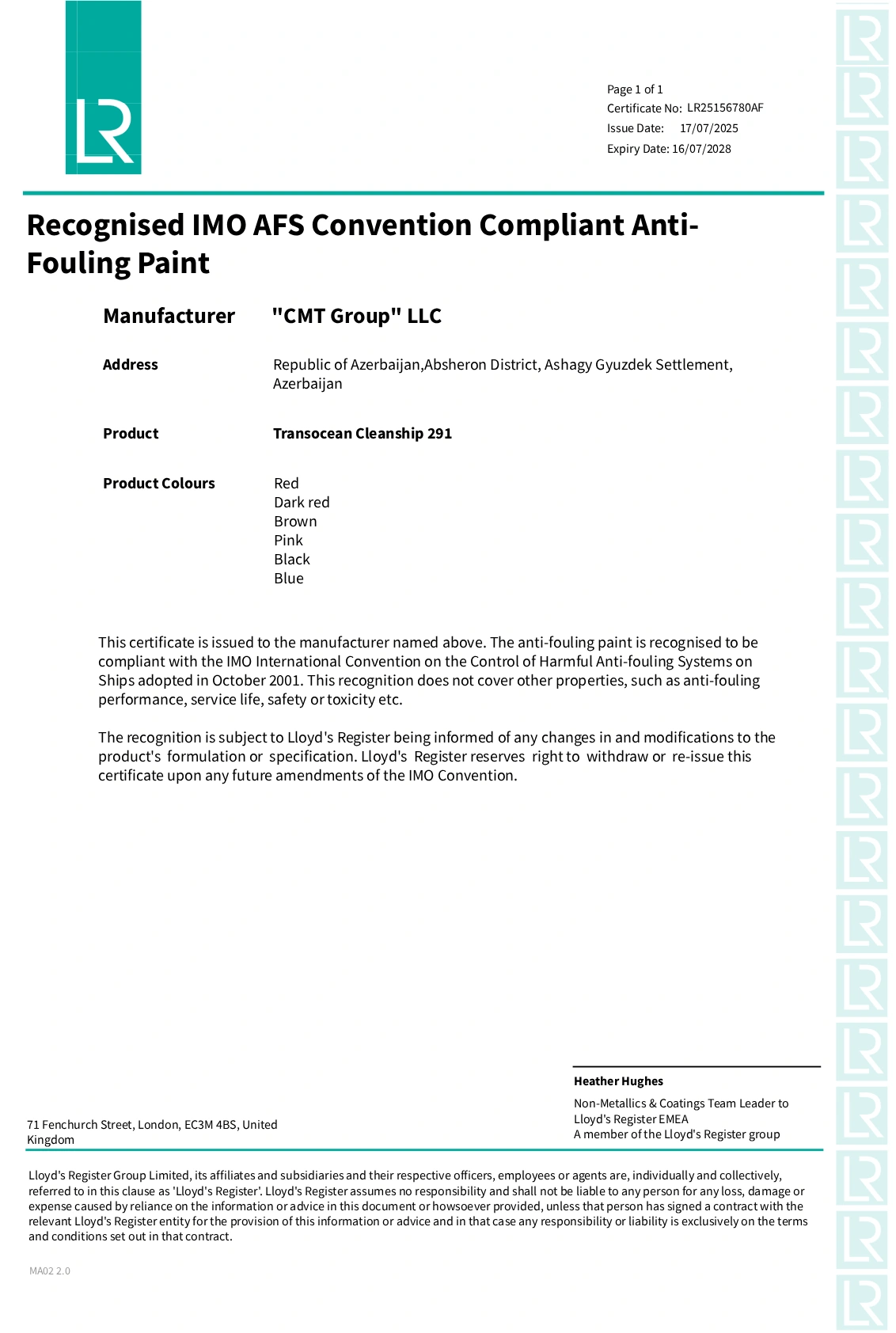 Belə ki, "CMT Group" şirkətinin gəmi boyalarının bir hissəsi – gəmi gövdələrində çirklənməyə qarşı boya, "Lloyd's Register EMEA"nın IMO AFS Konvensiyasına Uyğun olan sertifikatı əsasında istehsal olunur. Məlumat üçün bildirək ki, "Lloyd's Register EMEA"nın sertifikatı ilə buraxılan bu boyalar gəmilərin gövdəsinə müxtəlif canlıların, o cümlədən yosunların yapışmasına mane olaraq gəminin korpusunu qoruyur və hərəkətini sürətləndirir. "CMT Group" bütün MDB məkanında belə sertifikata malik olan yeganə şirkətdir.
