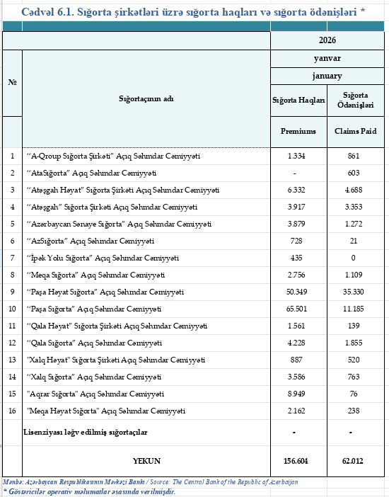 2026-cı ilin yanvar ayında Azərbaycandakı 16 sığorta şirkəti tərəfindən 156 milyon 604 min manat sığorta haqqı yığılıb.