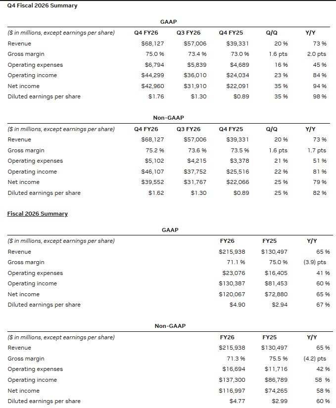 NVIDIA 25 yanvar 2026-cı il tarixində başa çatan dördüncü rüb üzrə 68,1 milyard dollar məbləğində rekord gəlir əldə etdiyini açıqlayıb. Bu, əvvəlki rüblə müqayisədə 20%, ötən ilin eyni dövrü ilə müqayisədə isə 73% artım deməkdir. 2026-cı maliyyə ili üzrə gəlir 215,9 milyard dollar olub ki, bu da ötən illə müqayisədə 65% artım göstərir.