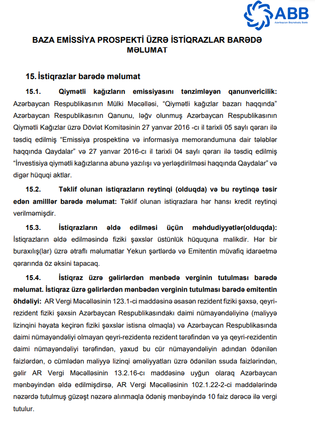 Marja.az Emissiya Prospektinə istinadən xəbər verir ki, Bank hər birinin nominal dəyəri 100 manat olan 1 milyon ədəd faizli, təmin edilməmiş, sənədsiz, adlı istiqrazlar buraxıb.