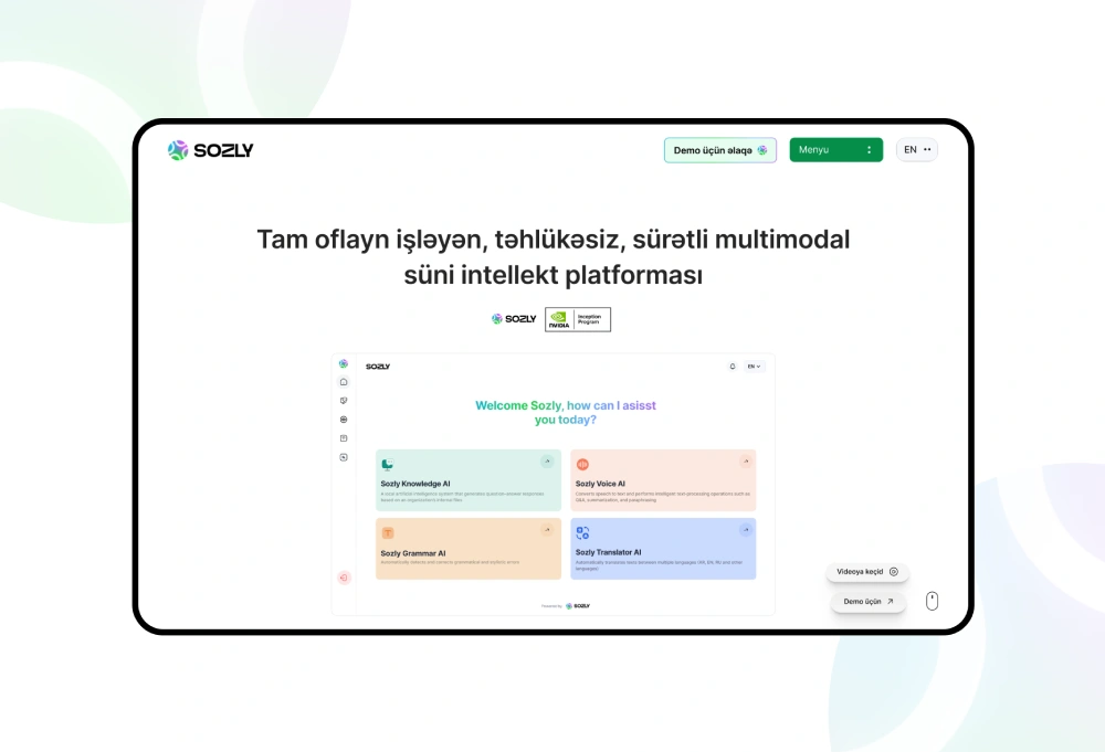 BIRAİNY MMC Sozly.ai milli süni intellekt platforması Azərbaycan süni intellekt texnologiyası korporativ AI həlləri oflayn süni intellekt sistemi lokal server AI həlli məlumat təhlükəsizliyi texnologiyaları enterprise AI platforması multimodal AI texnologiyası mətn səs və sənəd emalı süni intellekt avtomatlaşdırma AI agent əsaslı arxitektura biznes proseslərinin avtomatlaşdırılması korporativ məlumatların qorunması Azərbaycan dilində AI Sozly Knowledge AI Sozly Voice AI Sozly Translator AI Sozly Grammar AI speech to text texnologiyası avtomatik tərcümə sistemi AI qrammatika yoxlama 52 dil tərcümə texnologiyası lokal AI infrastrukturu NVIDIA Inception Program NVIDIA Azərbaycan texnologiya startapı AI innovasiya Azərbaycan korporativ texnologiya həlləri Fuad Tağıyev