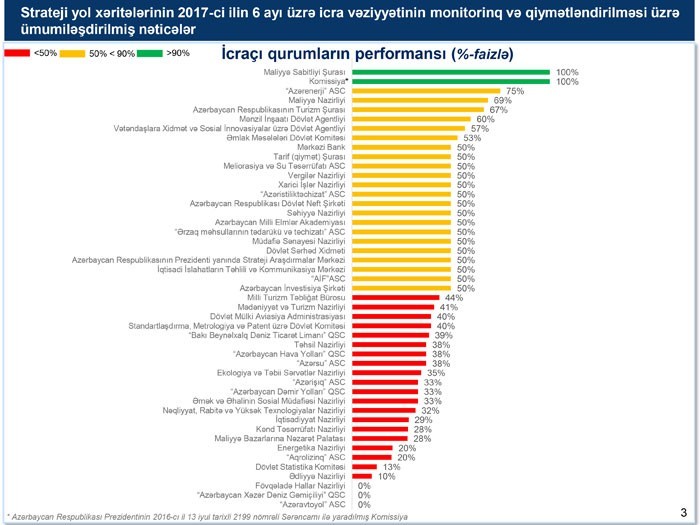 Maliyyə Sabitliyi Şurası və “Azərbaycan Respublikasında biznes mühitinin əlverişliliyinin artırılması və beynəlxalq reytinqlərdə ölkəmizin mövqeyinin daha da yaxşılaşdırılması ilə bağlı əlavə tədbirlər haqqında” Azərbaycan Respublikası Prezidentinin 2016-cı il 13 iyul tarixli Sərəncamı ilə yaradılan Komissiya üzərinə düşən işləri 100 faiz icra etmişdir. “Azərenerji” ASC 75 faiz, Maliyyə Nazirliyi 69 faiz, Turizm Şurası 67 faiz, Mənzil İnşaatı Dövlət Agentliyi 60 faiz, Vətəndaşlara Xidmət və Sosial İnnovasiyalar üzrə Dövlət Agentliyi 57 faiz, Əmlak Məsələləri Dövlət Komitəsi 53 faiz icra göstəricisinə malikdir. 16 qurum 2017-ci ilin birinci yarısı üzrə strateji yol xəritələrində nəzərdə tutulan tədbirlərin 50 faizini, 20 qurum 50 faizdən azını və nəhayət 3 qurum isə (Fövqəladə Hallar Nazirliyi, Azərbaycan Xəzər Dəniz Gəmiçiliyi QSC, Azəravtoyol ASC)heç bir tədbiri icra etməyib.