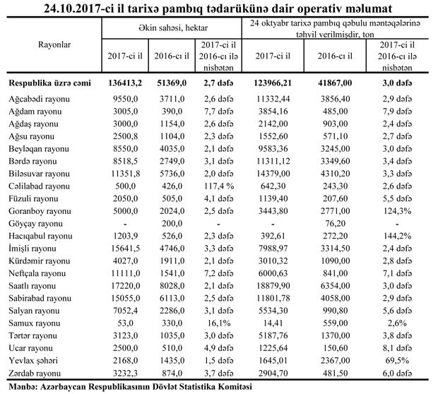 Dövlət Statistika Komitəsindən bildiriblər ki, bu, ötən ilin müvafiq dövrü ilə müqayisədə 3 dəfə çoxdur. Belə ki, keçən il oktyabrın 24-dək pambıq qəbulu məntəqələri 41 min 867 ton məhsul tədarük etmişdi.