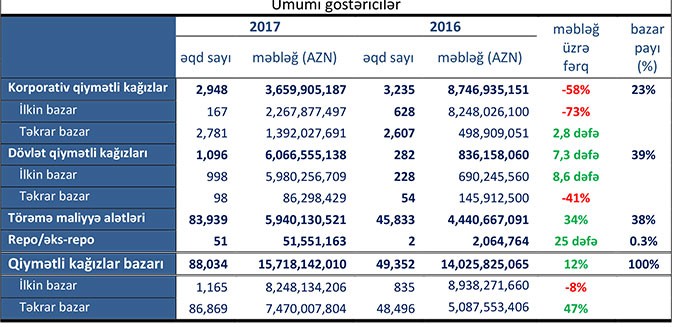 Maliyyə Bazarlarına Nəzarət , 2017-ci ildə qiymətli kağızlar bazarı 2016-cı illə müqayisədə 12% artaraq 15,7 mlrd. manat təşkil etmişdir. Hesabat dövründə dövlət qiymətli kağızlar bazarı 7,3 dəfə, korporativ qiymətli kağızların təkrar bazarı isə 2,8 dəfə artmışdır.