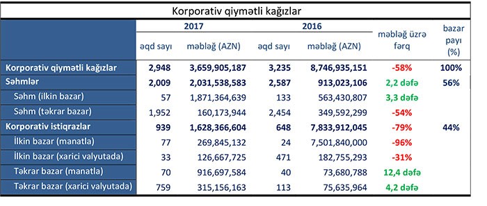 Ötən il ərzində real sektor təmsilçilərinin və maliyyə institutlarının fond bazarı vasitəsilə öz kapitallarını artırmaq təşəbbüsləri nəticəsində korporativ qiymətli kağızlar bazarının səhm seqmentində əqdlərin məbləği 2,2 dəfə artaraq 2 mlrd. manatı üstələmişdir. Xüsusilə banklar tərəfindən kapital tələblərinin təmin edilməsi məqsədilə nizamnamə kapitallarının artırılması səhm bazarının artımını şərtləndirən mühüm amil olmuşdur. Korporativ qiymətli kağızlar bazarının digər seqmenti olan korporativ istiqrazlar bazarı ötən illə müqayisədə 79% azalaraq 1,6 mlrd. manat təşkil etmişdir.