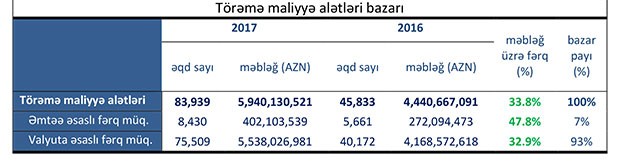 2017-ci ildə Bakı Fond Birjasının törəmə maliyyə alətləri platformasında ümumi məbləği 5,5 mlrd. manat olan valyuta əsaslı və ümumi dəyəri 402 mln. manat olan əmtəə əsaslı törəmə maliyyə alətləri ilə ticarət əməliyyatları həyata keçirilmişdir. Ümumilikdə törəmə maliyyə alətləri bazarının ümumi həcmi 5,9 mlrd.manat olmuş və bazarda keçən ilin müvafiq dövrü ilə müqayisədə 33,8% artım müşahidə edilmişdir.
