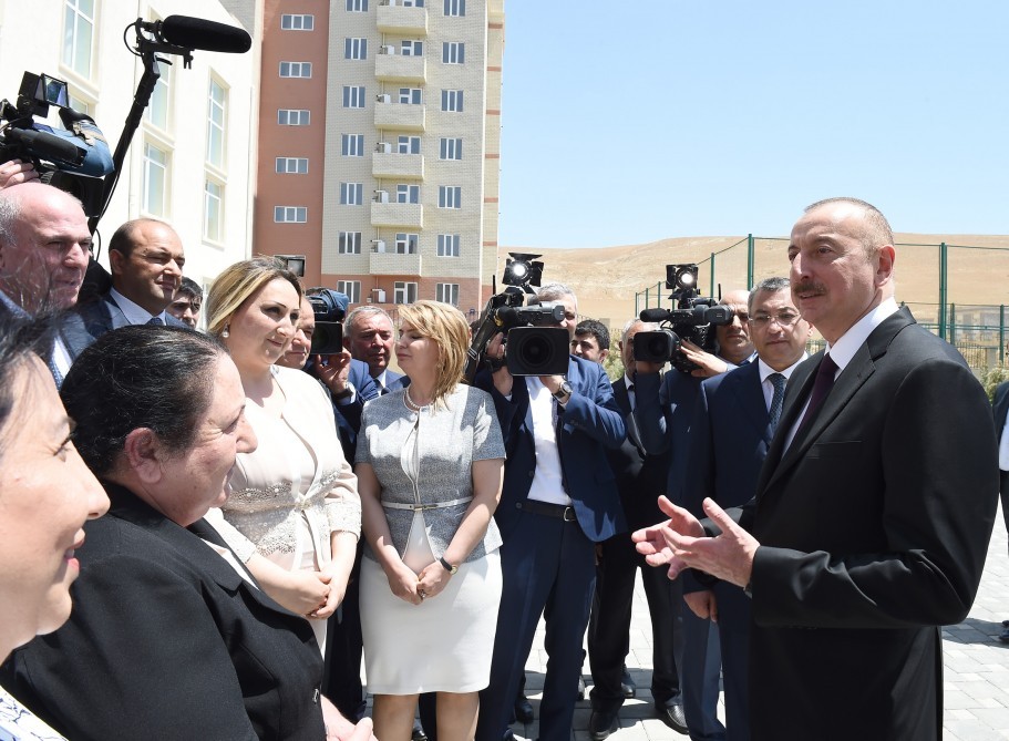 “Bu gün açılışına toplaşdığımız kompleksin bütün infrastrukturu yaradılıb. Elektrik, su, qaz xətləri, bütün infrastruktur məsələləri həll olunub, yollar çəkilib, həm qəsəbədaxili, həm də magistral yola çıxış yolu salınıbdır. Doqquzmərtəbəli on bir yaşayış binası tikilib, gözəl şərait yaradılıb. Mən indi mənzillərlə tanış olmuşam. Mənzillərin ümumi sahəsi 73 min kvadratmetrdir. Gözəl məktəb - 624 şagird yerlik, uşaq bağçası - 220 nəfərlik, tibb məntəqəsi, poçt məntəqəsi, polis məntəqəsi, yəni, yaşamaq üçün bütün şərait yaradılıb və ən yüksək səviyyədə. Gözəl ictimai zonalar yaradılıb, ağaclar əkilib, parklar salınıb. Hesab edirəm ki, bu, köçkün şəhərciklərinin arasında öz gözəlliyi və şəraiti ilə seçilən mərkəzlərdən biridir.