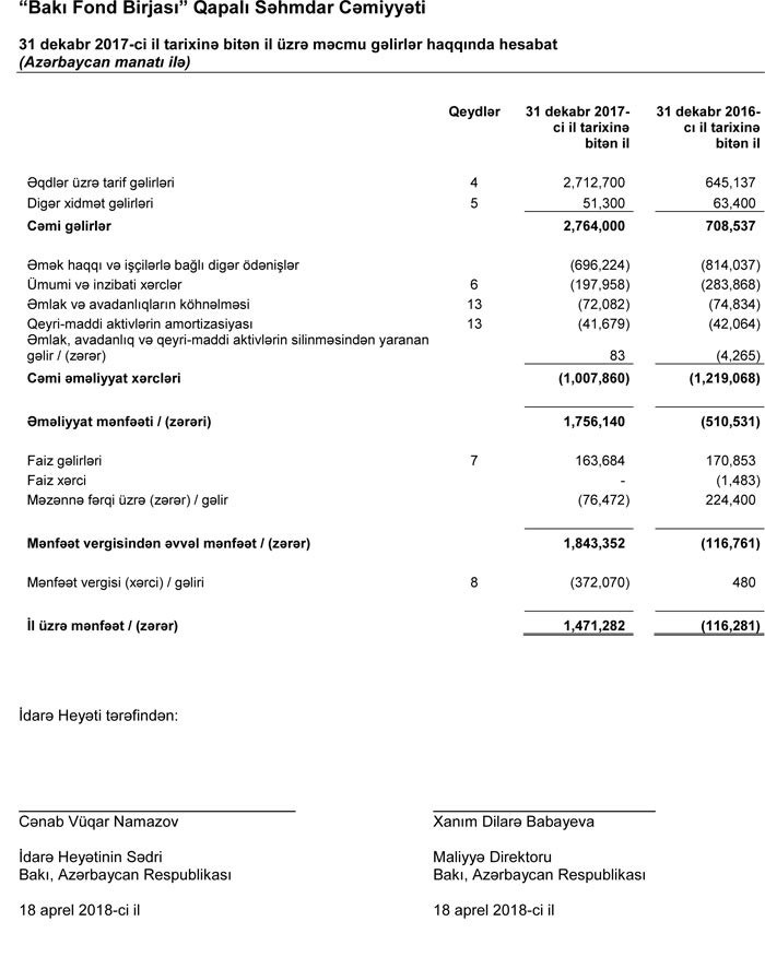 “Bakı Fond Birjası” QSC 2017-ci ili 1 milyon 471 min manat xalis mənfəətlə başa vurub. Halbuki birja, 2016-cı ili 116 min 281 manat zərər ilə bağlamışdı.