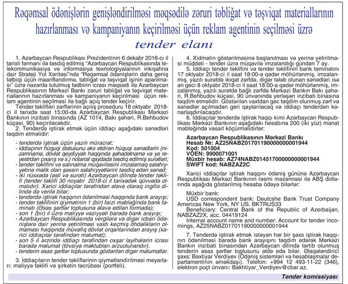 Azərbaycan Mərkəzi Bankı rəqəmsal ödənişlərin genişləndirilməsi məqsədilə zəruri təbliğat və təşviqat materillarının hazırlanması və kampaniyanın keçirilməsi üçün reklam agentinin seçilməsi üzrə tender elan edir: