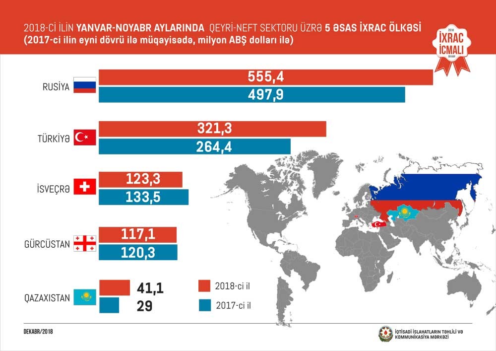 Ötən ilin müvafiq dövrü ilə müqayisədə 2018-ci ilin 11 ayı ərzində Rusiyaya qeyri-neft ixracı 12%, Türkiyəyə 22%, Qazaxıstana 42% artıb, İsveçrəyə 8%, Gürcüstana isə 3% azalıb.