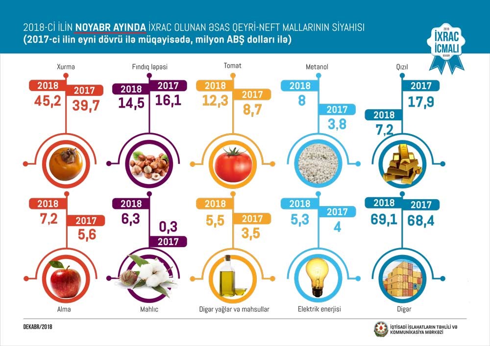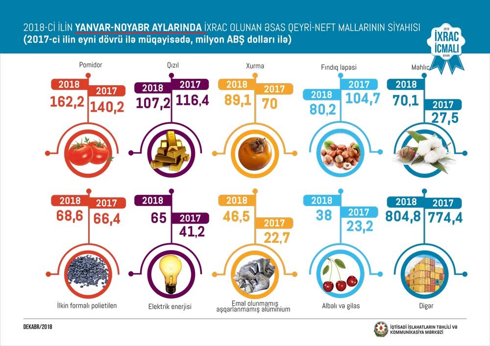 Ümumiyyətlə 2018-ci ilin yanvar-noyabr ayları ərzində meyvə-tərəvəz ixracı 495 milyon, plastmassa və onlardan hazırlanan məmulatların ixracı 110,3 milyon, alüminium və ondan hazırlanan məmulatların ixracı 106,6 milyon, elektrik enerjisinin ixracı 65 milyon, qara metallar və onlardan hazırlanan məmulatların ixracı 78,9 milyon, pambıq lifi ixracı 70,9 milyon, kimya sənayesi məhsullarının ixracı 73,3 milyon, pambıq ipliyi ixracı 21,3 milyon ABŞ dolları təşkil edib. 2017-ci ilin müvafiq dövrü ilə müqayisədə 2018-ci ilin 11 ayında pambıq lifinin ixracı 2,5 dəfə, elektrik enerjisinin ixracı 58 faiz, pambıq ipliyinin ixracı 44 faiz, plastmassa və onlardan hazırlanan məmulatların ixracı 25 faiz, meyvə-tərəvəzin ixracı 9 faiz, qara metallar və onlardan hazırlanan məmulatların ixracı 7 faiz, kimya sənayesi məhsulları 1 faiz artıb.