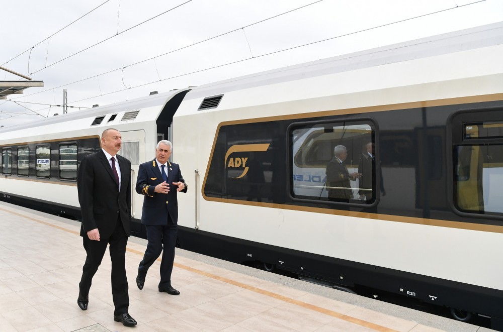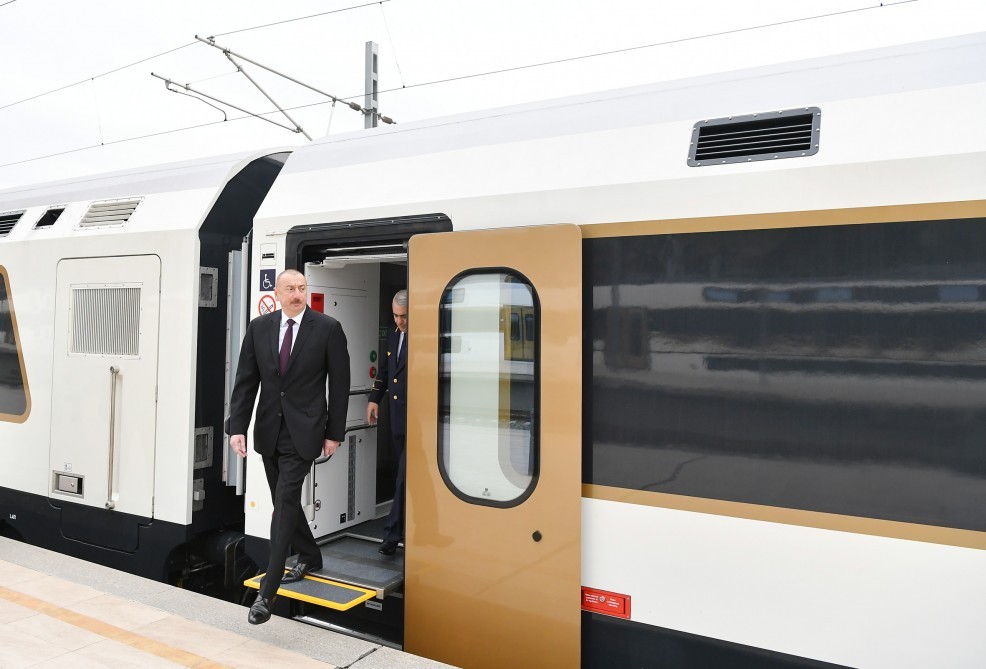 Sonra Prezident İlham Əliyev Bakı-Tbilisi-Qars dəmir yolu xəttində hərəkət edəcək sərnişin qatarı ilə tanış olub.
