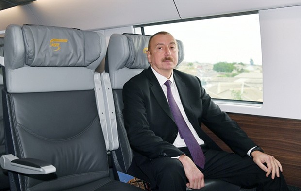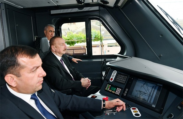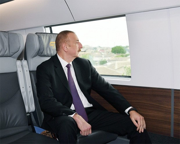 Sonra Prezident İlham Əliyev Bakı sərnişin - Sabunçu dəmir yolu xətti üzrə görülən işlərlə tanış olmaq üçün qatarla Bakı Dəmir Yolu Vağzalına yola düşüb.