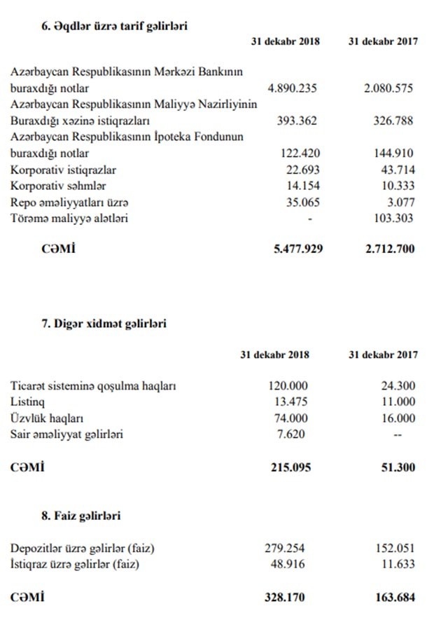 Ötən il Birjanın 5 milyon 693 min manat cəmi gəlirlərinin 5 milyon 478 min manatını əqdlər üzrə tarif gəlirləri, o cümlədən 4 milyon 890 min manatını Mərkəzi Bankın buraxdığı notlar üzrə, 393 min manatını Maliyyə Nazirliyinin istiqrazları üzrə tarif gəlirləri, 194 min manatını İpoteka Fondunun notları, korporativ istiqrazlar, korporativ səhmlər və repo əməliyyatları üzrə tarif gəlirləri təşkil edib. Əgər Mərkəzi Bankın notları üzrə tarif gəlirləri olmasaydı Bakı Fond Birjasının gəlirləri azalardı və ili zərər ilə başa vurardı. Bu ildən Mərkəzi Bank pul siyasətini yumuşaltmaqla bərabər emissiya etdiyi notları azaldır. Bu da Birjanın tarif gəlirlərinin azalmasına səbəb olacaqdır. Digər qiymətli kağızların buraxılışı üzrə ciddi dəyişikliklər olmasa 2019-cu ildə Bakı Fond Birjasının cəmi gəlirləri azala bilər.