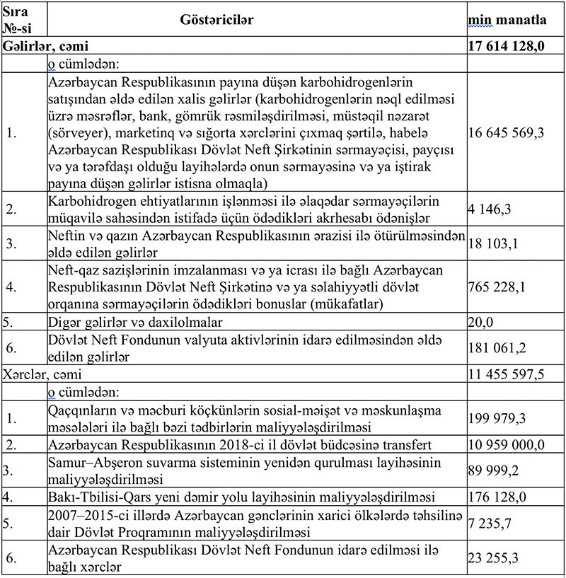 "Marja" xəbər verir ki, Sərəncam ilə Azərbaycan Respublikası Dövlət Neft Fondunun 2018-ci il büdcəsinin icrası, gəlirlər 17 milyard 614 milyon 128 min manat, xərclər 11 milyard 455 min 597,5 min manat və ya Fondun 2018-ci il büdcəsində nəzərdə tutulana nisbətən gəlirlər üzrə 115,0%, xərclər üzrə 99,8% səviyyəsində olmaqla, aşağıdakı kimi təsdiq edilib: