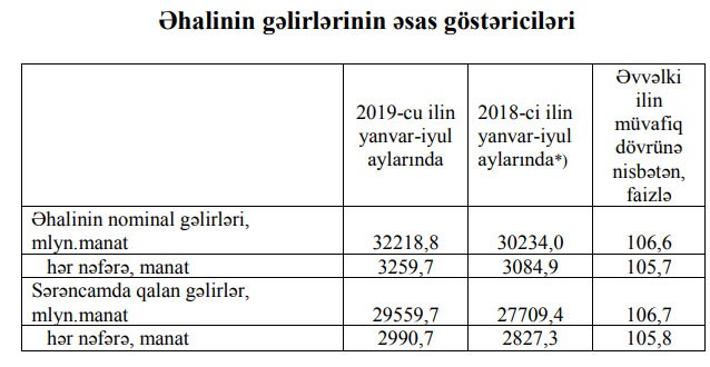Bütün icbari və könüllü ödənişlər edildikdən sonra əhalinin sərəncamında 29 milyard 559,7 milyon manatlıq və ya əvvəlki ilin eyni dövrünə nisbətən 6,7 faiz çox vəsait qalmışdır.