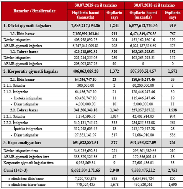 Birjanın yaydığı məlumatda bildirilir ki, 2019-cu ilin 7 ayı ərzində qiymətli kağızlar üzrə keçirilən əməliyyatların ümumi həcmində ötən ilin 7 ayına nəzərən 14.4% artım qeydə alınmışdır. 2018-ci ilin analoji dövrü üzrə əməliyyatların həcmi 7 milyard 588 milyon 475 min manat təşkil etmişdi.
