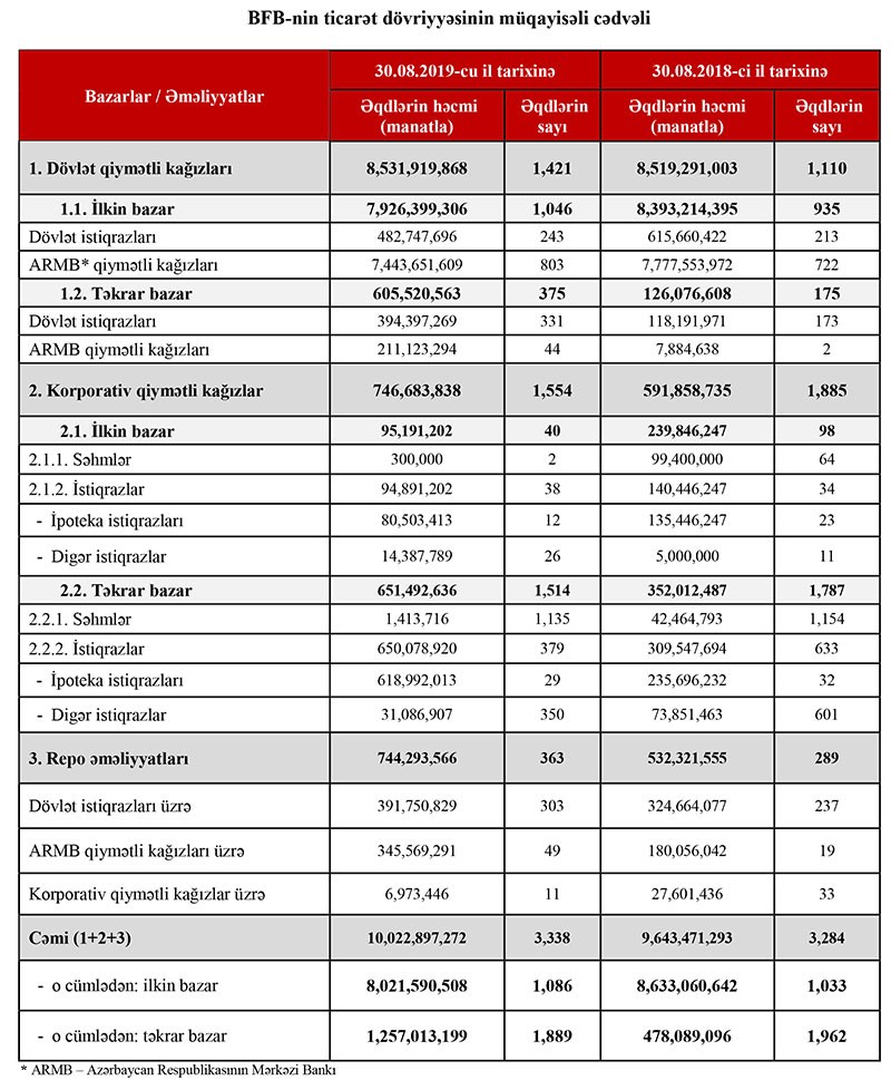 2018-ci ilin analoji dövrü üzrə əməliyyatların həcmi 9 milyard 643 milyon 471 min manat olmuşdu. Nəticə olaraq, 2019-cu ilin ilk 8 ayı ərzində qiymətli kağızlar üzrə keçirilən əməliyyatların ümumi həcmində ötən ilin ilk 8 ayına nəzərən 4% artım qeydə alınıb.
