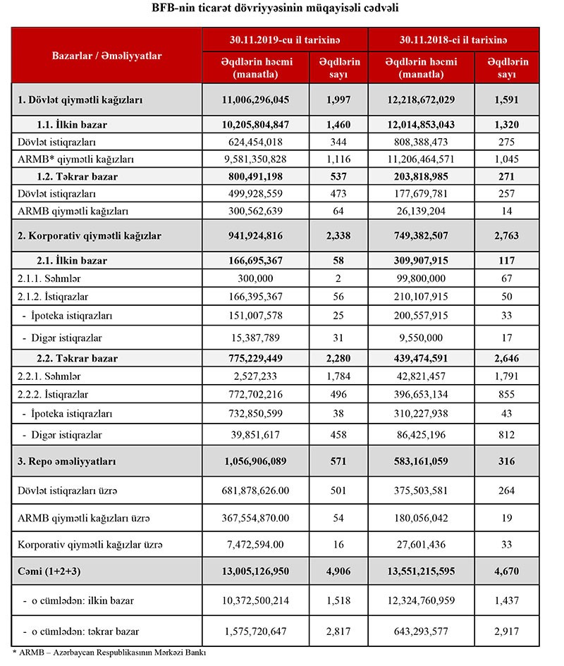 Bakı Fond Birjasında 2019-cu ilin 11 ayı ərzində qiymətli kağızlar üzrə keçirilən əməliyyatların ümumi həcmi 13 milyard 5 milyon 127 min manat təşkil etmişdir. Birjanın aylıq statistikasına görə, bu, 2018-ci ilin eyni dövrü ilə müqayisədə 546 milyon 88 min manat və ya 4% azdır.