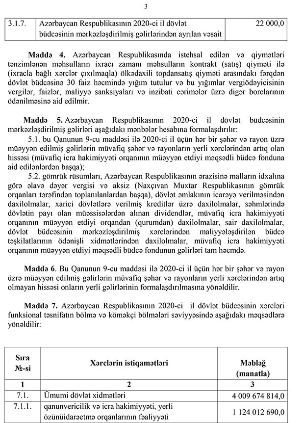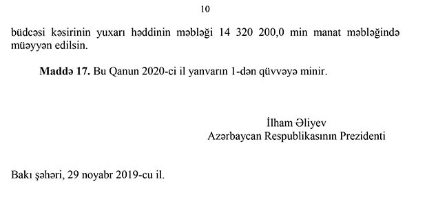Azərbaycan Prezidenti İlham Əliyev "Azərbaycan Respublikasının 2020-ci il dövlət büdcəsi haqqında" Qanunu imzalayıb.