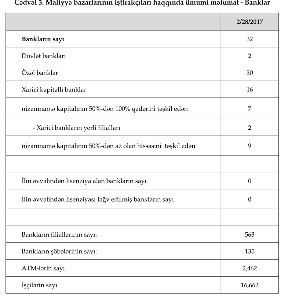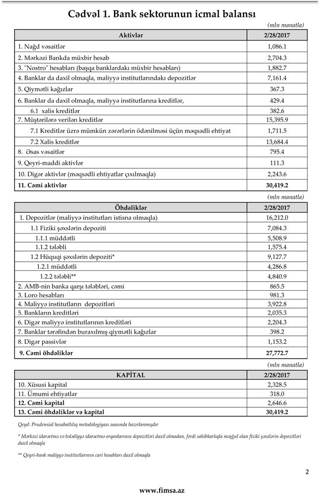 2017-ci ilin 28 fevral tarixinə olan bank sektorunun əsas göstəriciləri bank sektorunun icmal göstəricilərində öz əksini tapmışdır.