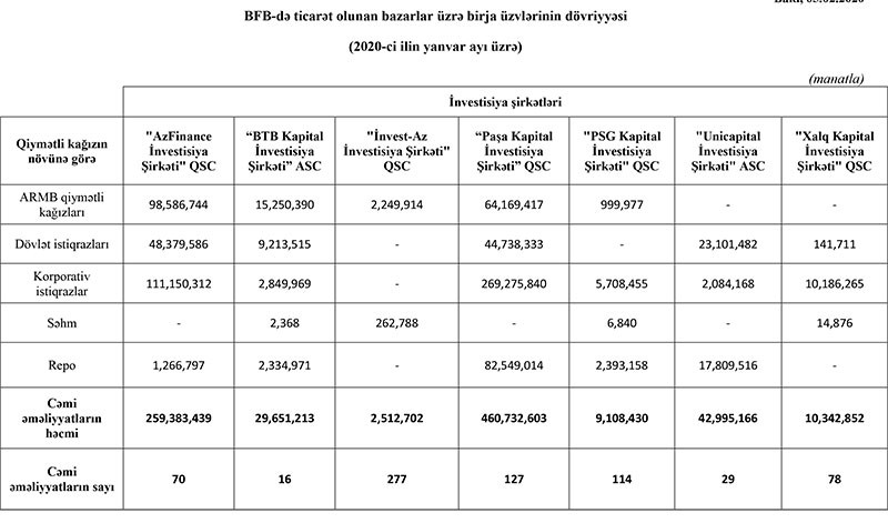 2020-ci ilin yanvar ayı ərzində Bakı Fond Birjasında (BFB) ticarət olunan bazarlar üzrə birja üzvlərinin dövriyyələri açıqlanıb.