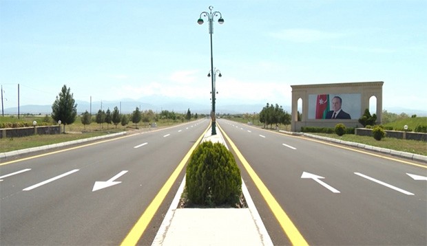 Prezident İlham Əliyev yolun rəmzi açılışını bildirən lenti kəsib.