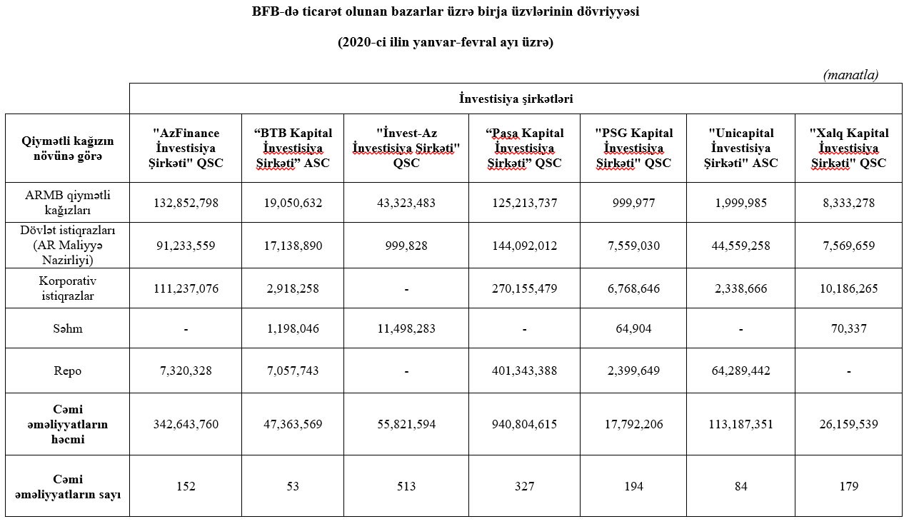 2020-ci ilin yanvar-fevral ayları ərzində Bakı Fond Birjasında (BFB) ticarət olunan bazarlar üzrə birja üzvlərinin dövriyyələri açıqlanıb.