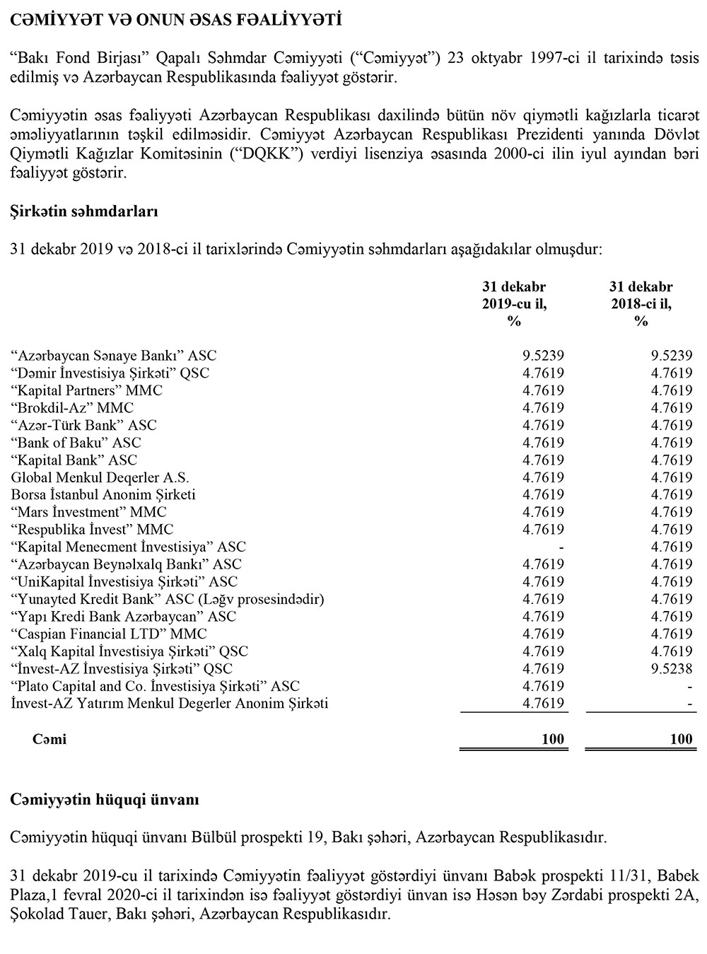 31 dekabr 2019-cu il tarixində “Bakı Fond Birjası” QSC-nin 11 səhmdarı olub. Bakı Fond Birjası 1 milyon 260 min manat nizamnamə kapitalına malikdir.