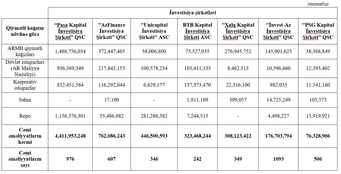 Marja Birjaya istinadən xəbər verir ki, 2020-ci ilin yanvar-iyun ayları ərzində “Paşa Kapital İnvestisiya Şirkəti” QSC 4 milyard 411 milyon 953 min manat dövriyyə ilə 1-ci, "AzFinance İnvestisiya Şirkəti" QSC 762 milyon 86 min manat dövriyyə ilə 2-ci, "Unicapital İnvestisiya Şirkəti" ASC 323 milyon 468 min manat dövriyyə ilə 3-cü olub.