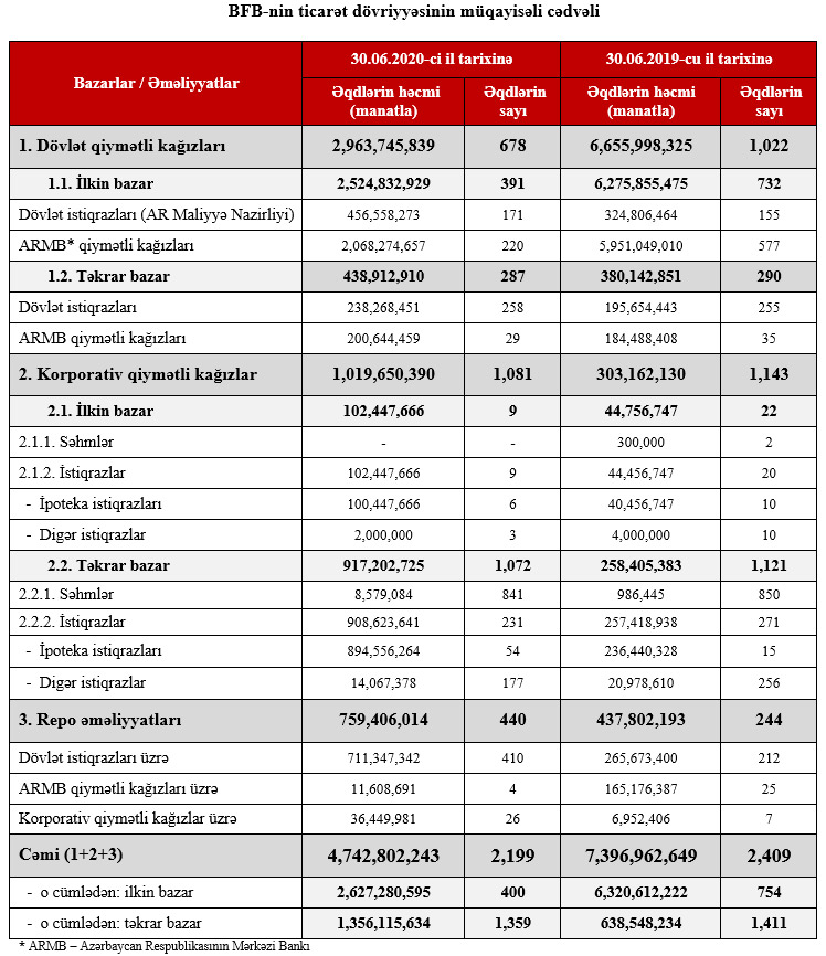 “2020-ci ilin yanvar-iyun ayları üzrə dövlət qiymətli kağızların (Mərkəzi Bank və Maliyyə Nazirliyi) ilkin bazarında yerləşdirmələrin həcmində ötən ilə nəzərən azalma müşahidə olumasına baxmayaraq, ümumi təkrar bazar üzrə ticarət həcmində 112%, repo əməliyyatları üzrə isə 73% böyümə qeydə alınmışdır,- məlumatda bildirilir.