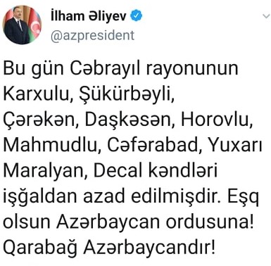 "Cəbrayıl rayonunun böyük hissəsi işğaldan azad olunub. Uzun müddətdən sonra Cəbrayıl işğaldan azad olundu. Cəbrayıl bizimdir".