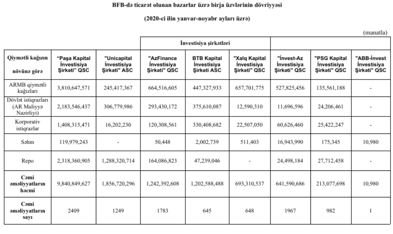 2020-ci ilin yanvar-noyabr aylarında, Bakı Fond Birjasında ticarət olunan bazarlar üzrə birja üzvlərinin dövriyyəsi açıqlanıb.