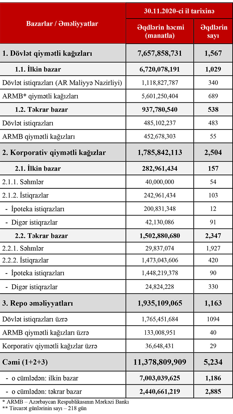 2020-ci ilin yanvar-noyabr ayları ərzində (11 ayda) Maliyyə Nazirliyi tərəfindən Bakı Fond Birjası vasitəsilə 1 milyard 118 milyon 828 min manatlıq dövlət istiqrazları yerləşdirilib.
